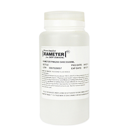Dow XIAMETER™ PMX-200 Silicone Fluid, 500 CS Clear is a non-toxic, odorless, polydimethyl-siloxane polymer that is used for lubricating, electrical insulating, furniture, metal, and automotive applications. It offers high shearability, compressibility, spreadability and low reactivity, surface energy, fire and environmental hazards. It is resistant to weather, water, chemicals, and oxidation. Packaged by KitPackers. 500 mL Bottle.