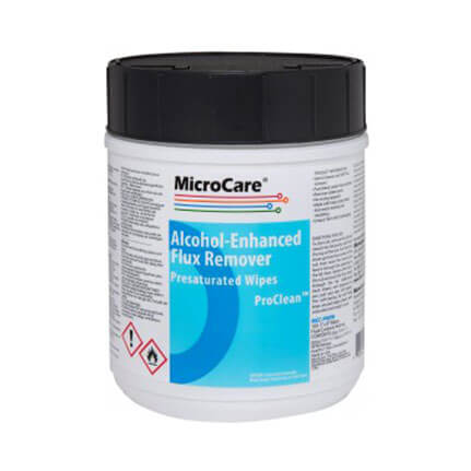 MicroCare ProClean™ Alcohol-Enhanced Flux Remover Wipes are a general purpose paste and flux cleaner designed for use on the electronics production line. The shred-proof polyester fabric wipes are disposable, non-corrosive, ESD and ozone safe, low GWP, and have unlimited shelf life. No rinsing required. 5 in x 8 in, Tub of 100.